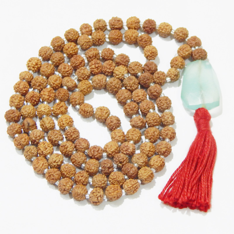 Rudraksha Mala mit facettiertem Trommelanhänger aus blauem Topas