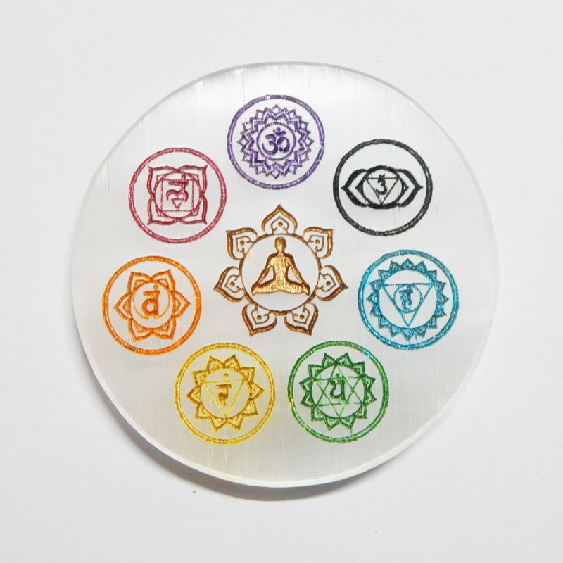 Selenite Plate with Carved 7 Chakra Mantra recharges and cleanse crystals and other spiritual items. It restores crystals natural vibrations by cleansing its negative energies.