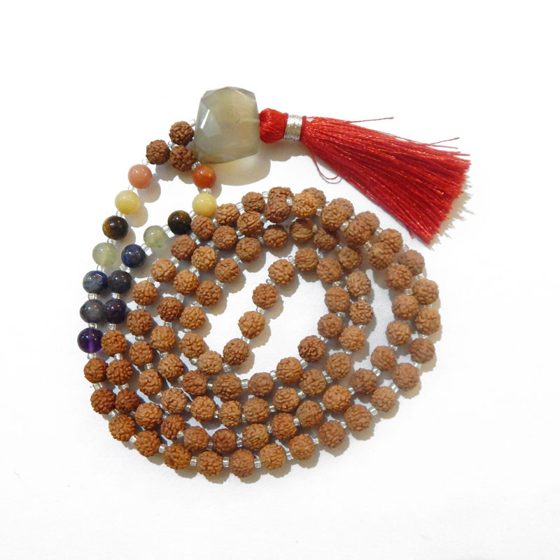 7 Chakra Rudraksha mala with Grey Moonstone faceted tumble pendant and 7 chakra gemstone beads provides powerful spiritual and health benefits. It is believed to balance all seven chakras, enhance intuition, and attract positive energy. The spiritual benefits of this mala help reduce stress, remove negativity, and promote inner peace. Health benefits include improved focus, emotional stability, and mental clarity. This mala also offers protective benefits, shielding the wearer from negative vibrations. Regular use of the 7 Chakra Rudraksha mala supports harmony, positivity, and overall well-being.