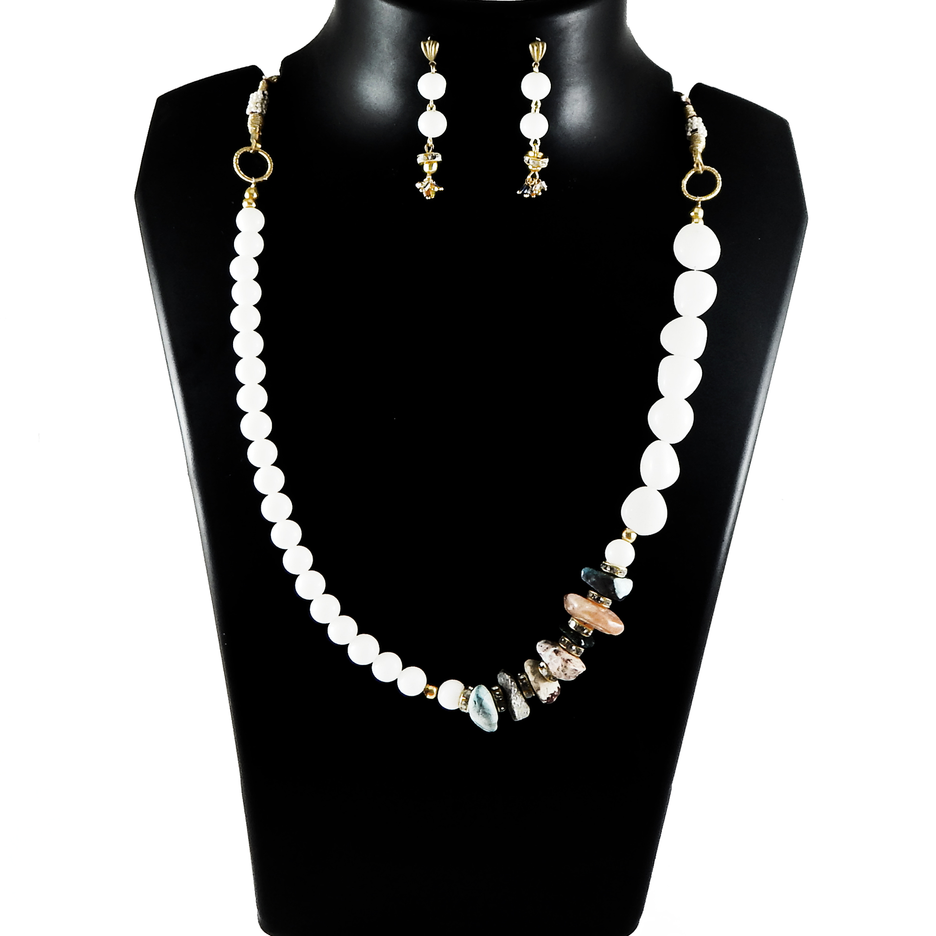 Elevate your style with this stunning Gemstone Necklace with Earring Set, designed to exude grace and sophistication. Featuring the serene beauty of White King tumbles and beads, this set represents purity and elegance. The soft and luminous tones are perfectly enhanced by the addition of gold-polished copper beads, lending a touch of opulence to the design.