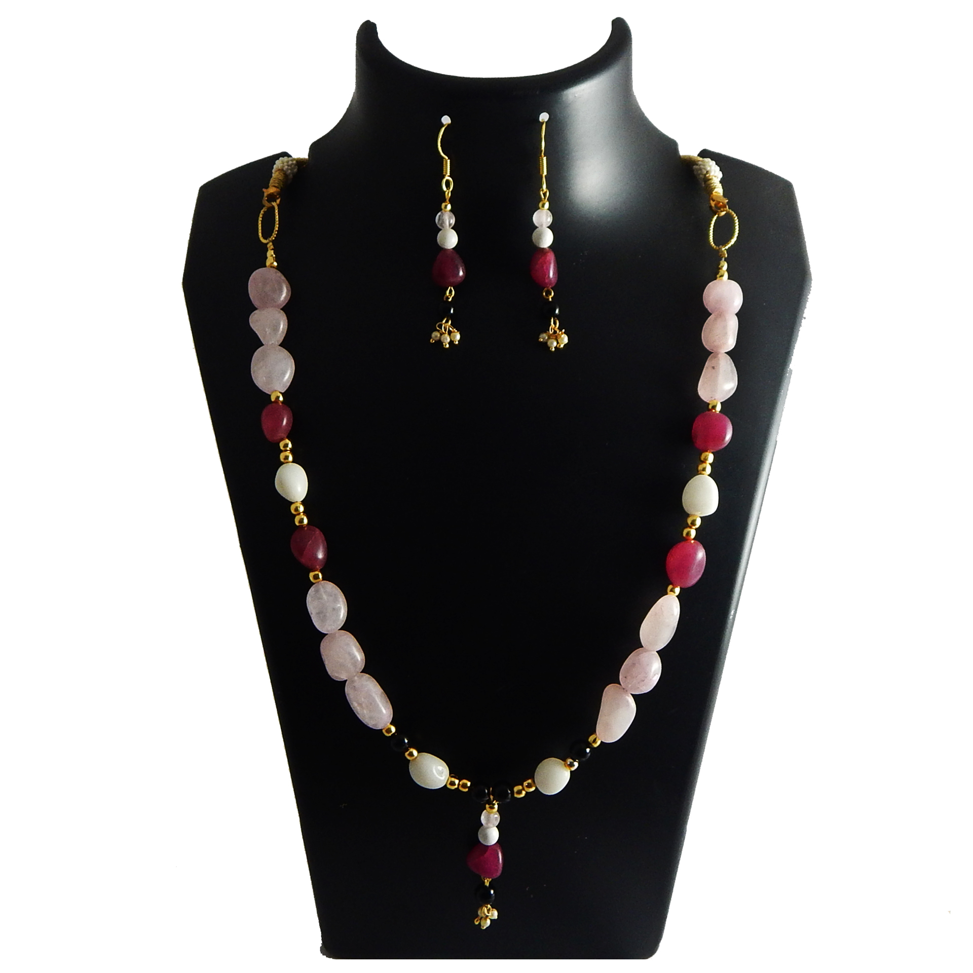 Embrace the timeless allure of this exquisite Gemstone Necklace with Earring Set, crafted to perfection with a captivating combination of Rose Quartz and Ruby tumbles and beads. The soft pink hues of Rose Quartz radiate a sense of love and tranquility, while the deep red of Ruby symbolizes passion and vitality.