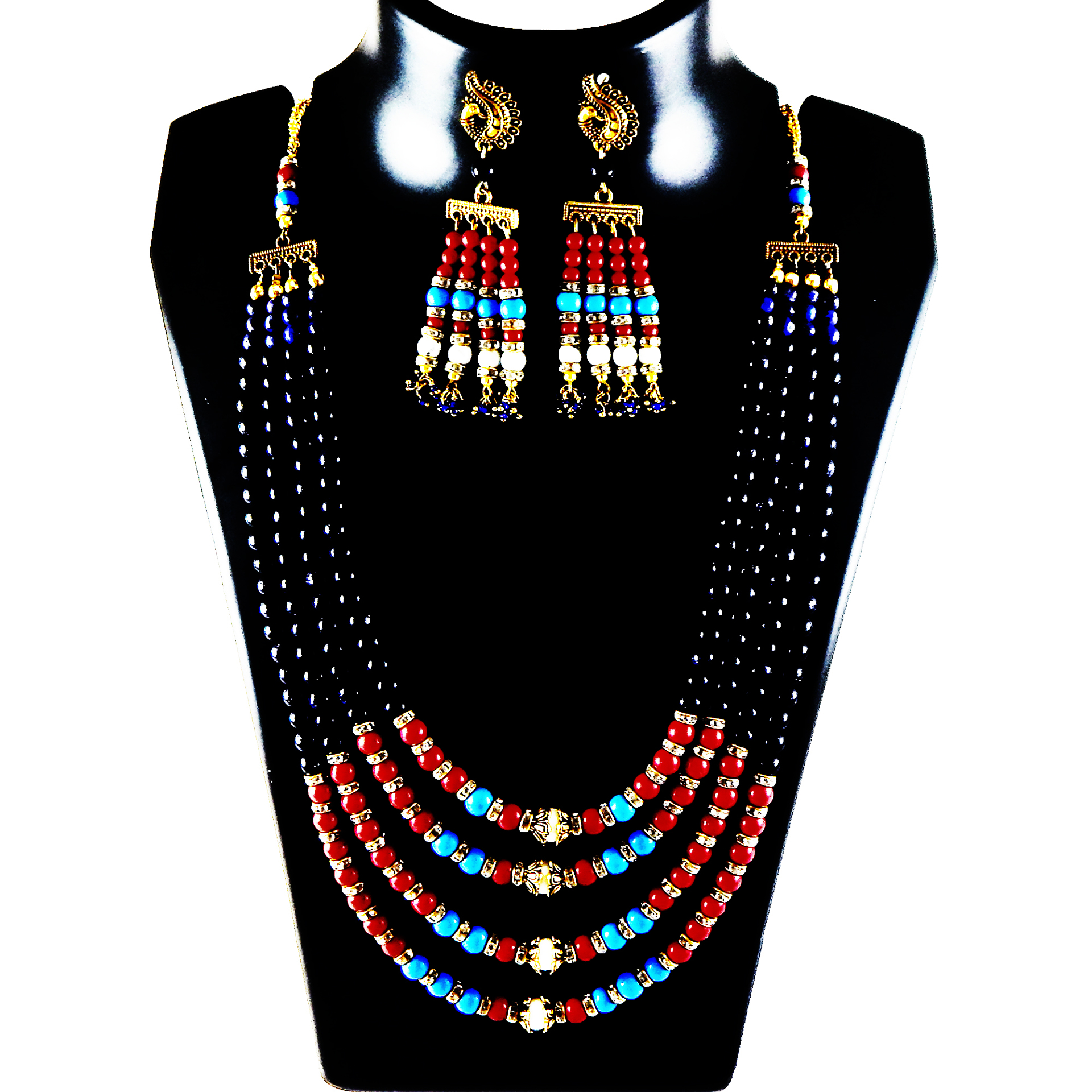 The Four-Line Gem Stone Necklace is a stunning creation, meticulously crafted to showcase the beauty of natural and manmade gemstones. At 10 inches long, this necklace features 6mm Blue Gold Stone beads, complemented by a mix of 5mm Lapis Lazuli, 6mm & 5mm Red Coral, 6mm Turquoise (manmade), and 8mm & 6mm Howlite. Its intricate design adds a touch of creativity and vibrancy to any look. Complete with matching earrings, this dangling necklace is perfect for every occasion, whether you’re attending a casual outing or a formal event. With its artistic composition and colorful charm, this necklace is a must-have for gemstone lovers.