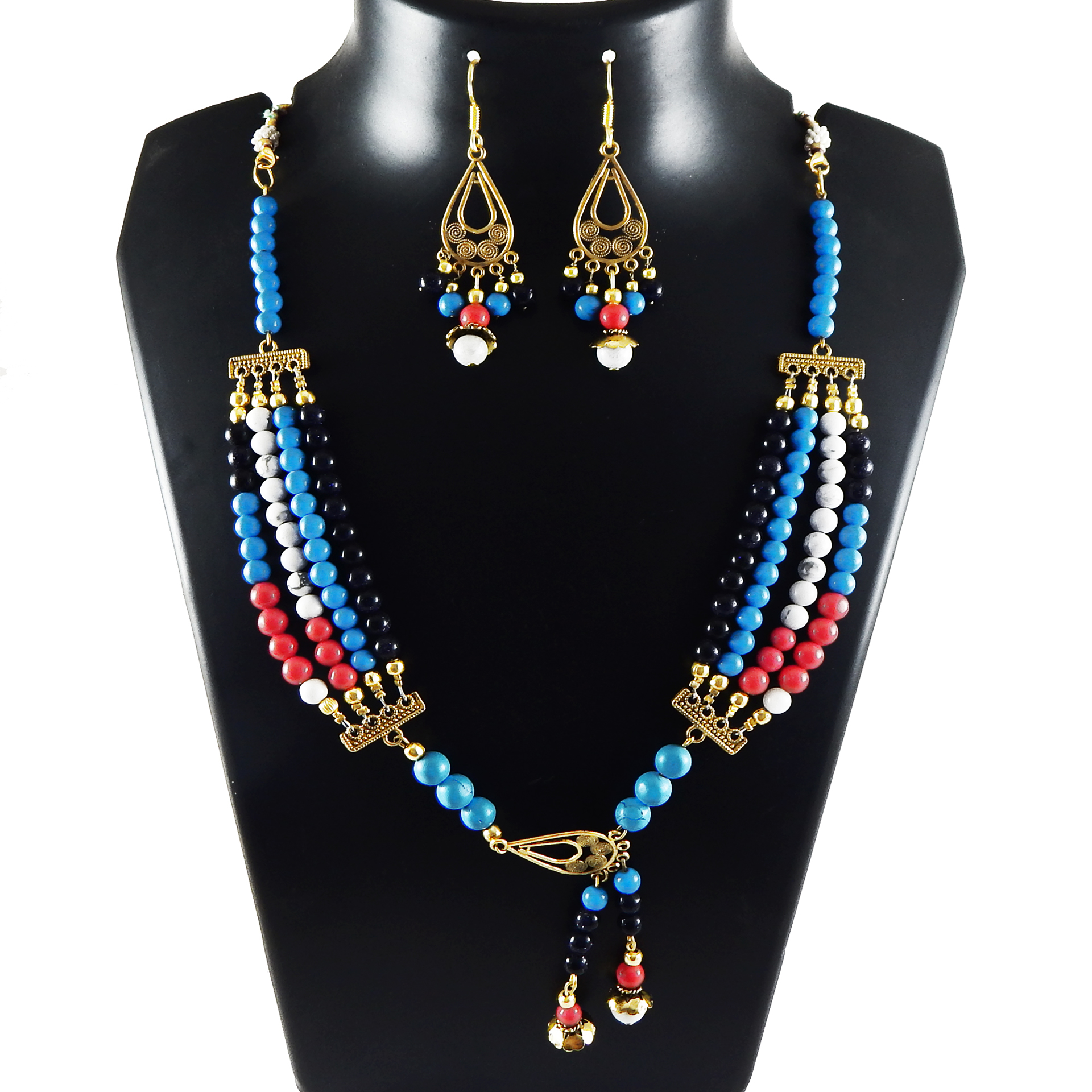The Four-Line Gem Stone Necklace is a captivating design that combines the natural beauty of gemstones with the charm of intricate craftsmanship. This stunning necklace features 6mm Turquoise beads, symbolizing tranquility and protection, Red Coral beads for vitality and energy, Blue Gold Stone beads, exuding a sparkling allure, and Howlite beads, known for promoting calmness and clarity. Enhanced with gold-polished copper findings, this necklace is as striking as it is meaningful. Measuring four elegant lines and paired with matching earrings, it’s a dazzling accessory suitable for every occasion. Its dangling design offers a graceful and timeless appeal, making it a must-have for those who value style and spiritual balance.