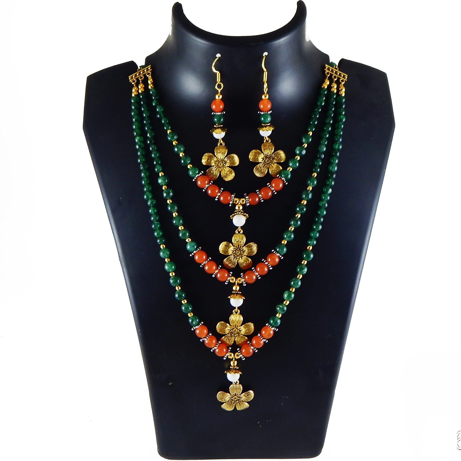 The Three-Line Gem Stone Necklace, measuring 11 inches, is a luxurious creation designed to captivate. This stunning necklace features a mix of 6mm and 8mm Green Aventurine beads, renowned for their calming and prosperity-enhancing properties. Accentuated by 8mm Carnelian beads, symbolizing vitality and motivation, and 8mm Howlite beads, known for promoting serenity and focus, this piece is both beautiful and meaningful. Small gold-polished metal pendants add an extra touch of sophistication, elevating the design to a new level of elegance. Paired with matching earrings, this dangling necklace is the perfect accessory for any occasion, blending timeless beauty with contemporary charm.