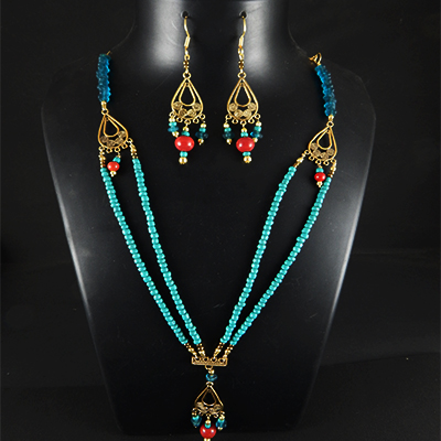 This exquisite Glass Beads Necklace with Earring Set combines colorful glass beads with carefully crafted gold polished copper findings to create a stunning accessory perfect for any occasion. The necklace’s vibrant beads are strung to form a harmonious and eye-catching design that rests comfortably around the neck. Accompanied by matching earrings, this set offers a complete, coordinated look that effortlessly enhances your style.