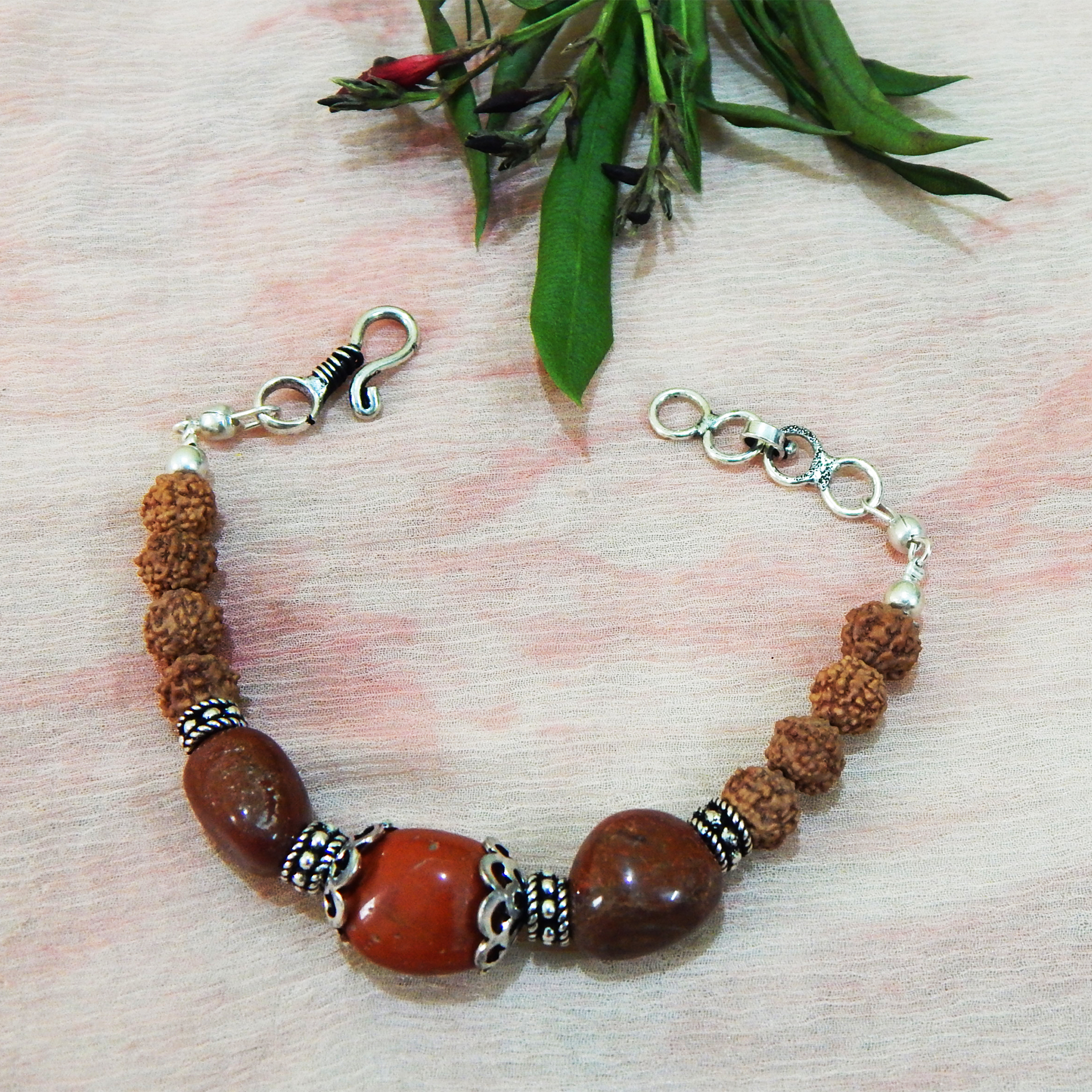 Empower yourself with the Red Jasper Tumble, Beads, and Rudraksha Bracelet, a dynamic blend of grounding and vitality. Red Jasper is celebrated for its stabilizing and strengthening properties, helping to build courage and resilience. Paired with the spiritual essence of Rudraksha beads and enhanced by silver-polished copper accents, this bracelet is ideal for anyone seeking to fortify their spiritual and emotional foundations.