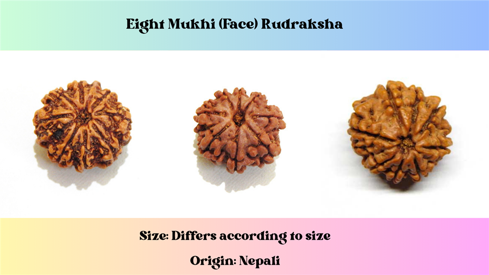 Eight (8) mukhi Rudraksha beads enhance intellect and well-being, provide a critical thinking and composition skill. For artists, having this rudraksha is highly beneficial as it enhances their artistic abilities and grants them recognition. treats gallbladder and nervous system illnesses, including depression. It eliminates Satern's and Rahu's negative effects.