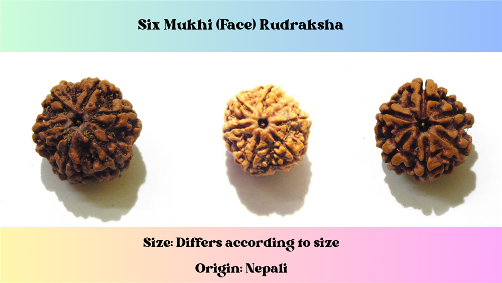 - The six-faced Rudraksha, connected to Lord Kartikeya, is believed to offer balance, harmony, and mental tranquility. Because of its connections to mental clarity and emotional stability, it frequently promotes mental peace.