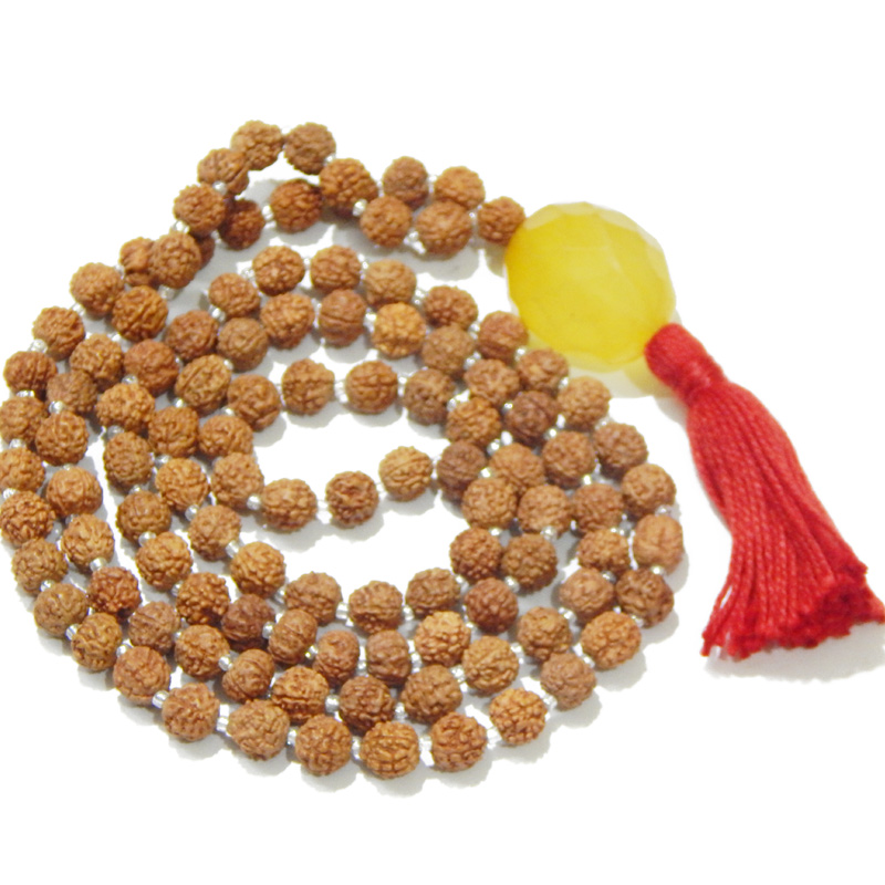 Die Rudraksha Mala mit facettiertem Yellow-Aventurine-Anhänger ist ein beeindruckendes Accessoire, das Tradition und Eleganz verbindet.