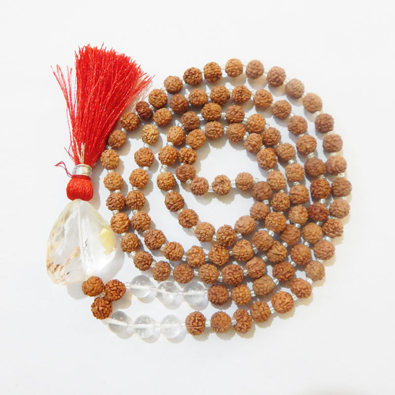 Rudraksha Power Mala made with 7mm Java Rudraksha, Crystal Quartz Beads and Crystal Quartz Pendant. 108 +1 Rudraksha, gemstone pendant and Red Tassels. Each mala is unique for special size pendant.