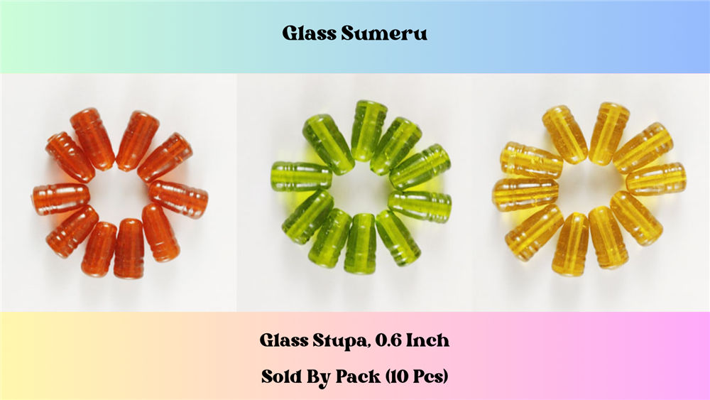 - Packs of ten Glass Sumeru Glass Stupas are available for purchase. For people who might require more than one stupa for ceremonies or spiritual practices, this packaging is convenient.