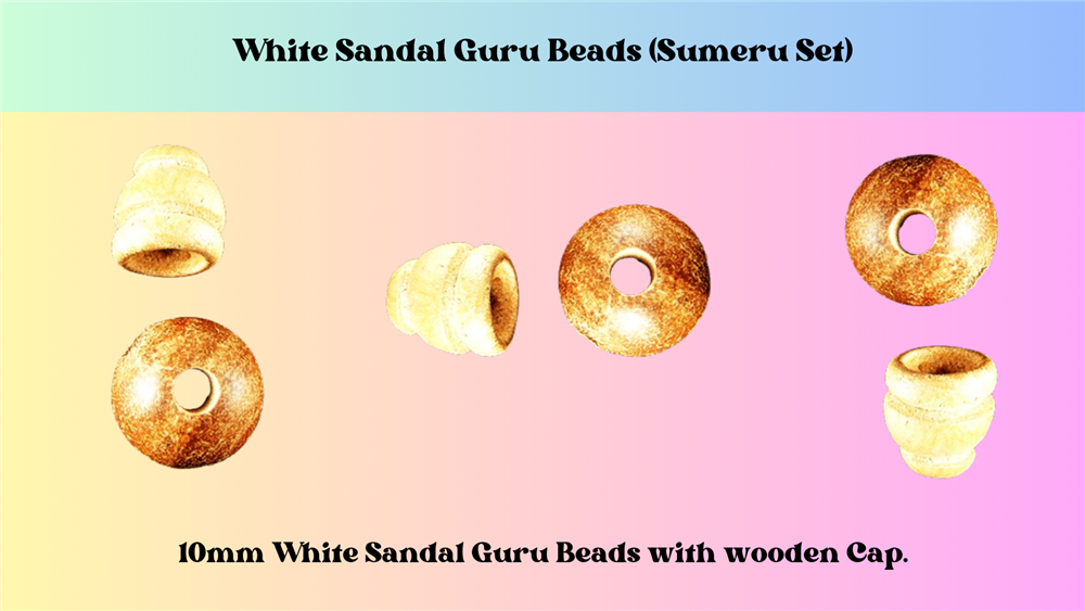 - These Guru beads, which are made of White Sandal Wood, have the calming and fragrant qualities of sandalwood. White sandal wood is valued for both its aroma and spiritual significance.