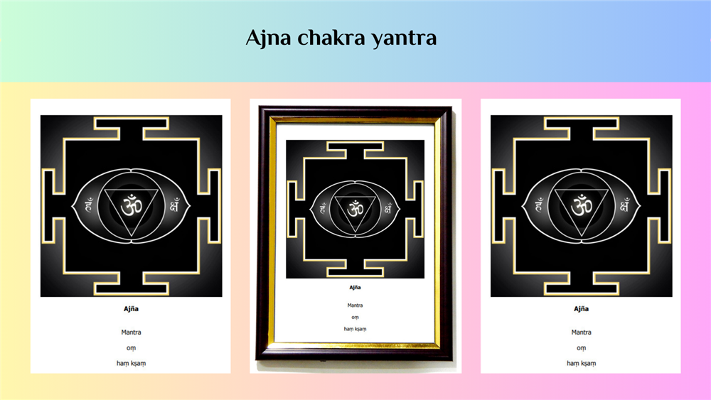 The Ajna chakra yantra is an image of the 6th energy place, Shiva and Shakti, situated at the third eye. It supports reflection, advancing profound development and self-acknowledgment. The mathematical plan of the yantra joins Shiva and Shakti energies, upgrading instinct and navigation.
