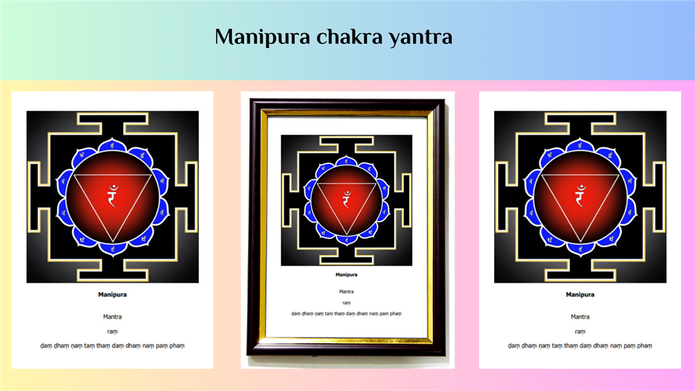 The Manipura chakra yantra, a mathematical plan utilized in contemplation and yoga, addresses the sun oriented plexus chakra, representing individual power, self-assurance, and strength. It comprises of a ten-petal lotus bloom with a modified triangle, representing change. Zeroing in on this yantra can upgrade determination and confidence, enabling people to claim their own power.